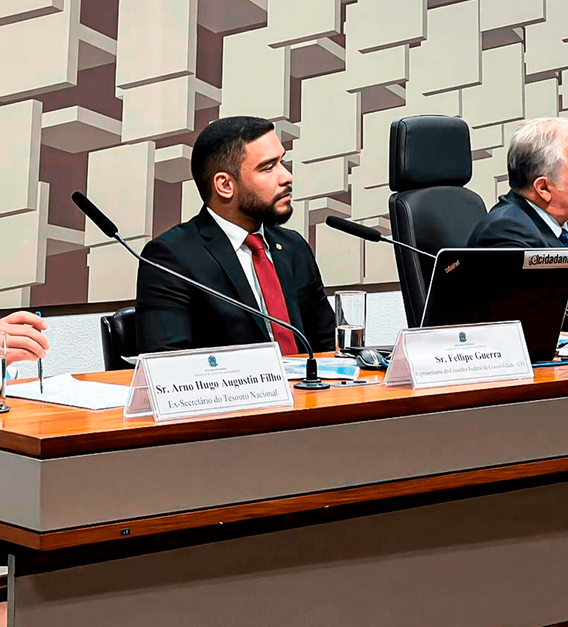 Fellipe Guerra, Contador e Advogado, Presidente do CRCCE. Pós-Doutor em Contabilidade (USP) e em e-Government (UFP-PT). Doutor em Ciência da Informação (UFP-PT/UFGRS), Mestre em Administração e Controladoria (UFC); Especialista em Direito e Processo Tributário. Autor e Coautor de 16 livros nas áreas de Contabilidade e Gestão Tributária. Membro da Academia de Ciências Contábeis do Ceará, Coordenador de Pós-graduação no IPOG Brasil e Sócio da Compliance Contadores e Guerra Advogados.